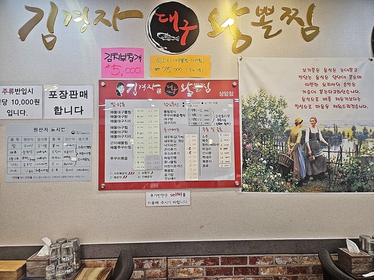 메뉴. 뽈찜이 메인이기 때문에 당연히 뽈찜이 있고 그 밖에 대구탕, 대구 지리, 아구찜, 아구탕과 해물 주꾸미 찜 등을 판매하고 있다. 우리는 해물대구뽈찜과 소주를 주문했다.