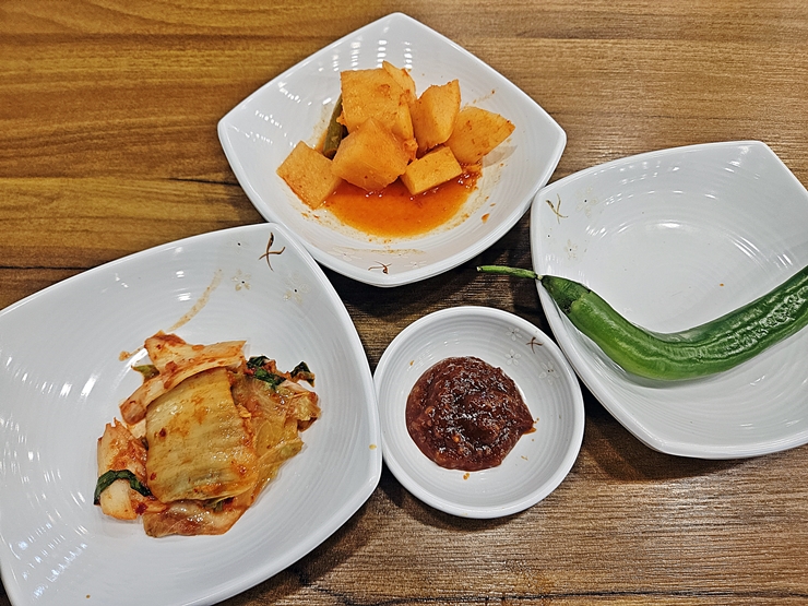 반찬. 김치, 깍두기, 쌈장과 고추가 나온다. 김치는 내 입에 너무 시었고 깍두기는 입에 잘 맞았다. 그래서 김치는 놔두고 깍두기만 먹었지.
