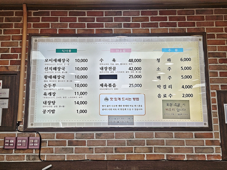 메뉴. 모이세 해장국, 선지 해장국, 황태 해장국, 순두부, 육개장, 내장탕, 수육과 제육 볶음을 판매하고 있다. 예전에 비해 가격이 좀 올랐다. 물가가 올랐으니 당연하지 않나 싶다. 난 예전처럼 내장탕을 주문했다.
