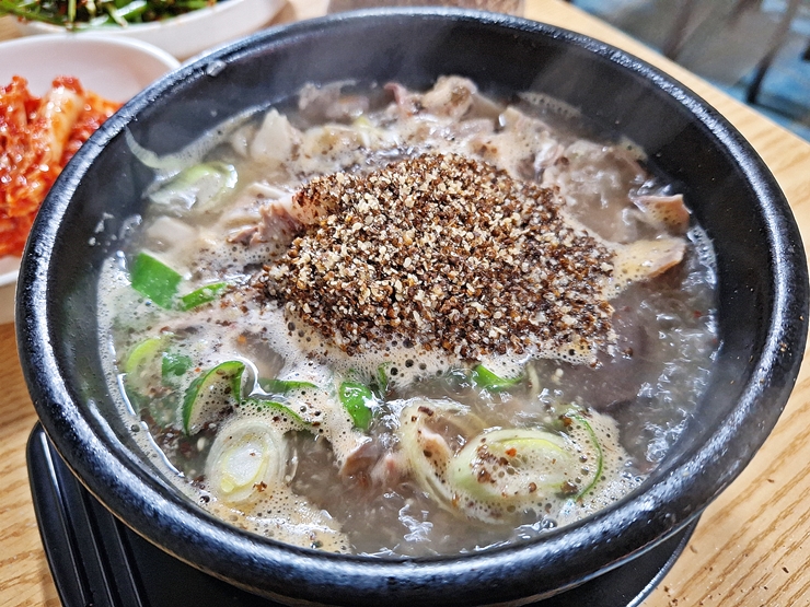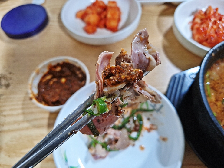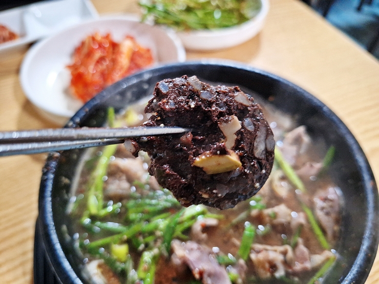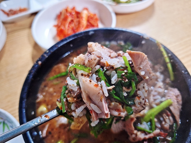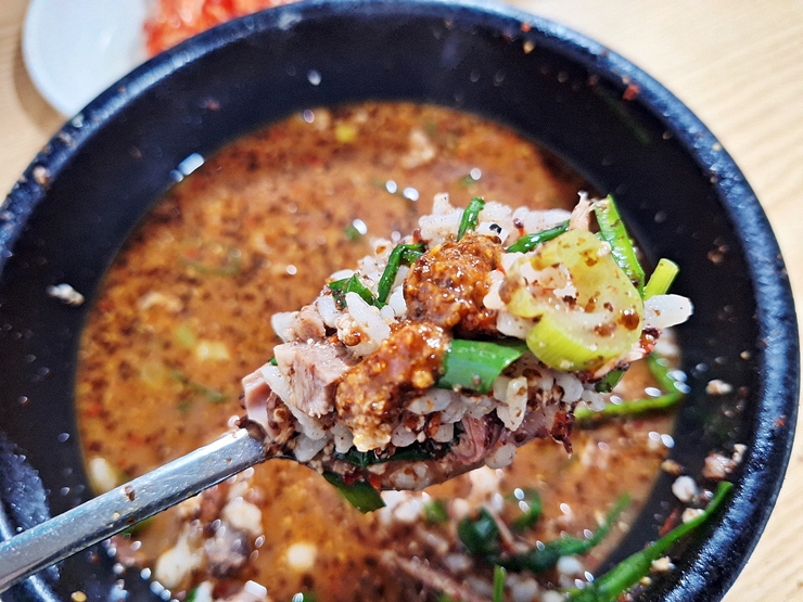 밥을 잘 말아서 크게 한 입 떠먹는다. 내장과 살코기가 굉장히 많이 들어 있다. 잡내가 전혀 나지 않고 특유의 구수한 냄새가 식욕을 자극한다.