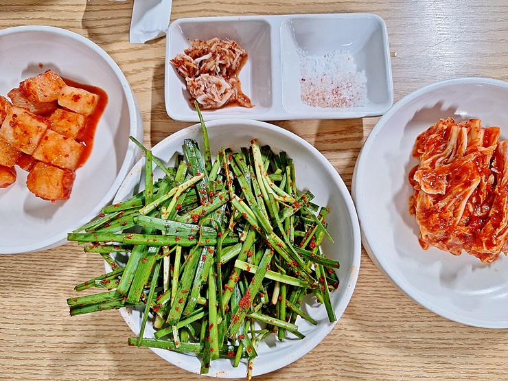 반찬. 깍두기, 새우젓, 소금, 부추 무침과 김치가 나온다. 변하지 않는 반찬이다. 이 부추 무침 맛이 상당히 좋은데 그냥 먹어도 맛있고, 순댓국에 넣어 먹어도 맛있다.