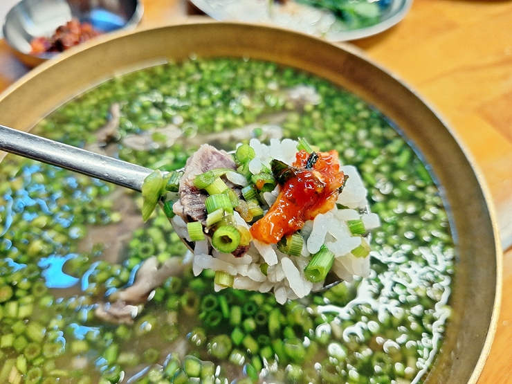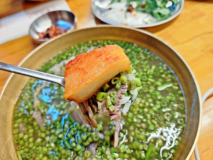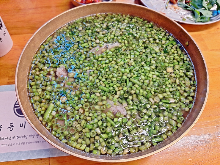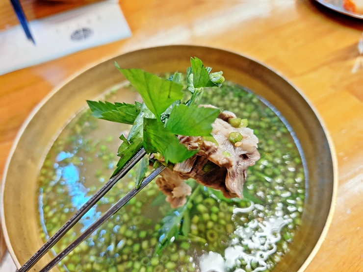 아름다운 모습의 미나리 곰탕. 곰탕 안에 미나리가 가득 들어있다. 밥은 토렴해서 나온다. 몇 년 전에 미나리 삼겹살이 크게 유행을 했던 적이 있었는데, 그 이후 인기가 조금 시들해 지더니 다시 이렇게 미나리가 유행하고 있다. 먼저 간을 하지 않고 국물 맛을 본다. 국물은 진하면서 느끼하지 않아 속이 저절로 풀리는 느낌이 든다.