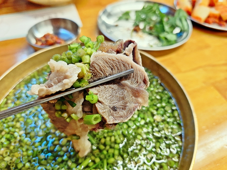 곰탕에 들어가는 고기는 차돌과 아롱사태를 사용하는 것 같다. 아롱사태의 쫀득하면서도 고소한 맛과 함께 차돌의 눅진한 맛이 인상적이다. 이런 고기를 먹을 때 술이 빠지는 것은 굉장히 섭섭한 일이지.