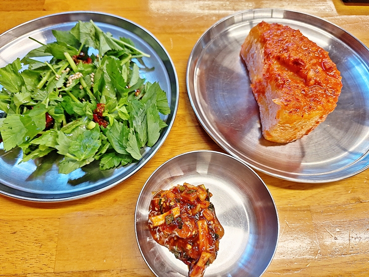 반찬. 미나리 무침, 무말랭이와 섞박지가 나온다. 섞박지는 알맞게 잘라서 먹으면 된다. 고기 반찬이 없지만 괜찮다. 고기를 먹기 위해 방문을 했으니까.