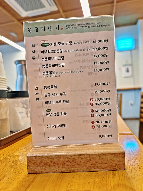 메뉴. 다양한 곰탕과 함께 육회, 수육, 전골과 꼬리찜을 판매하고 있다. 우리는 미나리 곰탕에 안주로 육회 한 접시를 주문했다. 술은 가볍게 마시기로 했지.