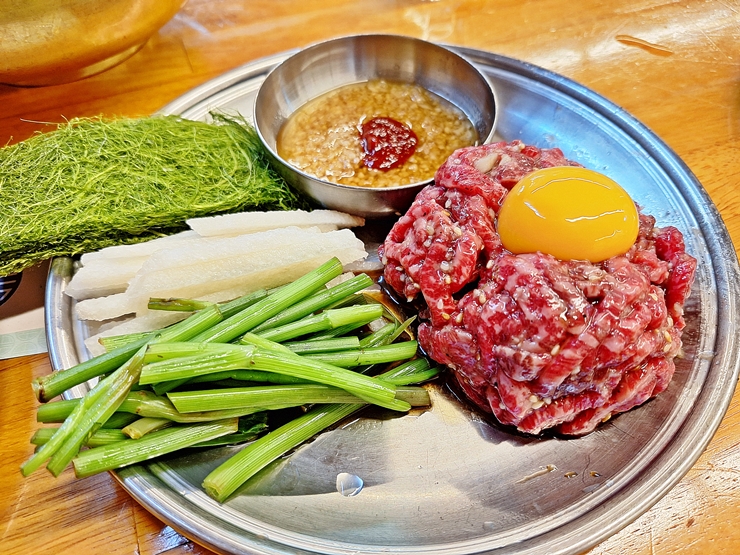 아름다운 모습의 육회. 육회와 함께 미나리, 배, 감태와 양념 장이 함께 나온다. 계란은 비벼 먹어도 좋고 따로 먹어도 좋다. 우리는 반으로 나눠 반은 그냥 먹고 반은 비벼 먹었다.