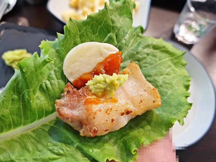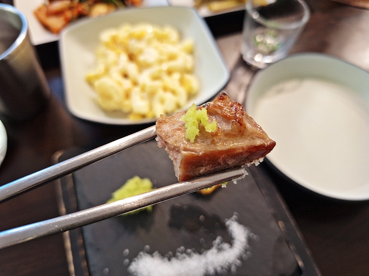 맛있게 잘 구워진 항정살 위에 와사비를 올려서 맛있게 냠냠. 항정살 특유의 서걱거리는 식감이 잘 느껴지고 눅진한 맛도 좋다. 하지만 오겹살이 더 맛있다.