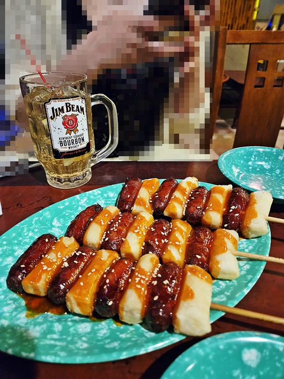 하이볼만 마시면 뭔가 서운하니까 짐빔 하이볼과 함께 소떡꼬치를 주문했다. 소떡꼬치는 방송에서 나와서 유명해진 음식인데, 예전에는 고속도로 휴게소에서만 볼 수 있었다. 방송에 나온 이후 이제는 길거리나 대형 마트에서도 쉽게 찾아볼 수 있는 음식이다. 대중적인 떡꼬치에 소시지를 함께 넣어 만든 것이니 어떻게 만들어도 맛이 없을 수가 없다. 소떡꼬치를 맛 업게 만들면 그 집은 장사할 능력과 가치가 없는 곳이다.