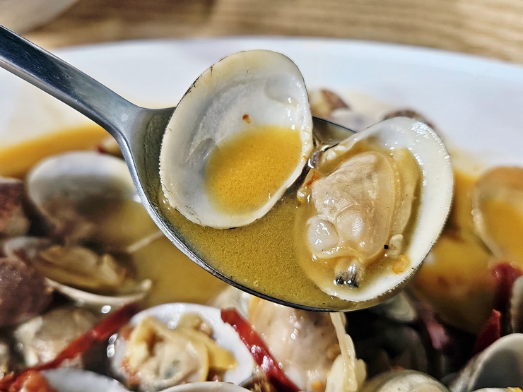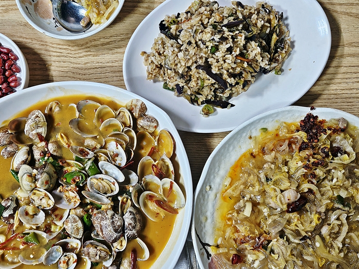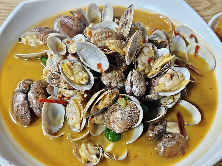 소홀에서 가장 유명하다고 하는 매운 바지락 볶음. 해감한 바지락을 매운 소스에 넣고 한 번 볶은 것이다. 국물이 흥건한 스타일이라 볶음보다 찜이라는 표현이 좀 더 잘 어울릴 것이다. 국물 색은 매워 보이지 않았는데 음식이 나올 때 매운 향이 확 느껴졌다.