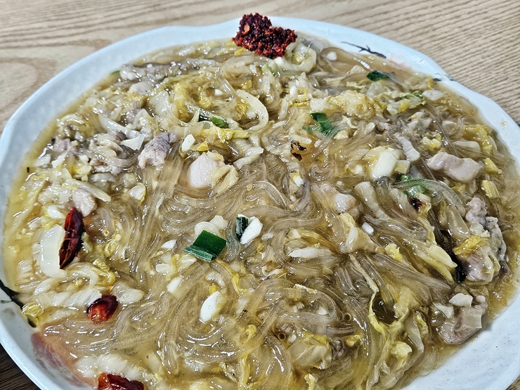 백침치 당면. 당면, 백김치, 고기, 고추와 파를 넣고 볶은 것이다. 중국에서는 쉽게 볼 수 있는 요리지만 한국에서는 쉽게 볼 수 없는 요리라서 주문했다.