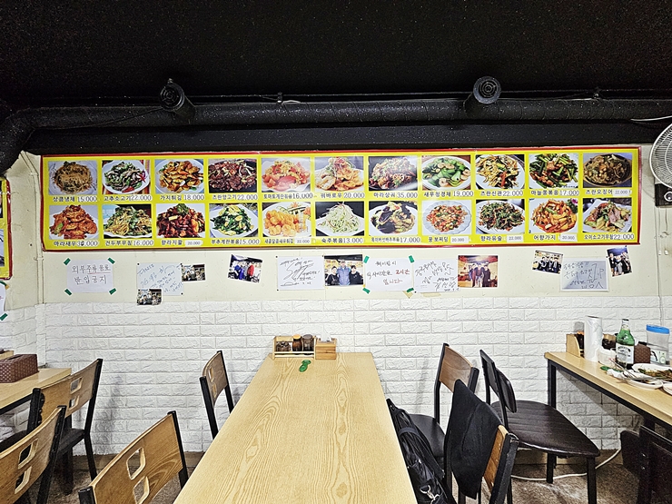 냉채, 돼지 고기 요리, 소고기 요리, 양고기 요리와 각종 채소 무침 등 다양한 중국 요리가 있다. 요리 이름을 중국어 발음대로 적은 것도 있어서 조금은 어색하게 느껴지는 것도 있다.