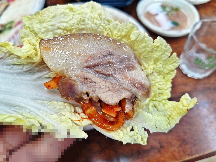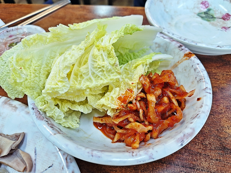 채소를 많이 먹으라는 짝꿍의 말을 잘 듣기 위해 양배추 위에 무생채와 머릿고기를 올려서도 맛있게 냠냠. 머릿고기가 상당히 쫀득하면서 풍미가 깊다. 머릿고기의 경우 보관을 잘못하면 굉장히 누린내가 나고 질겨지기 마련인데, 그런 불쾌한 것은 전혀 느낄 수 없었다.