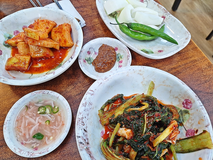반찬. 깍두기, 된장, 새우젓, 양파, 고추와 열무 김치가 나온다. 김치와 된장은 직접 담그는 것이라고 한다. 열무 김치의 시원한 맛이 참 좋아서 한 번 리필을 했다.