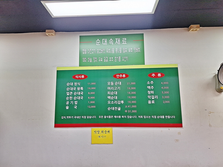 메뉴. 순대 전문점이라는 것이 느껴진다. 순대 이외에는 다른 메뉴가 전혀 없다. 그리고 소주를 4,000원에 판매하고 있다. 이제는 소주를 이 가격에서 파는 곳을 서울에서 정말 찾기 힘들어졌는데 참으로 반가운 일이 아닐 수 없다. 우리는 술국과 모둠 순대를 주문했다.