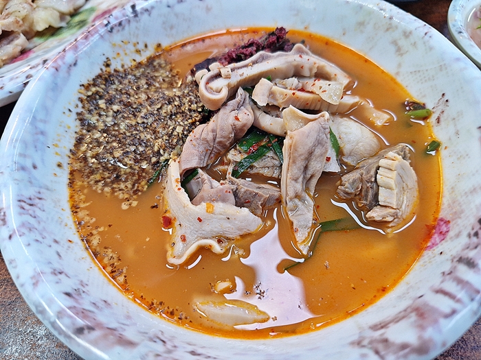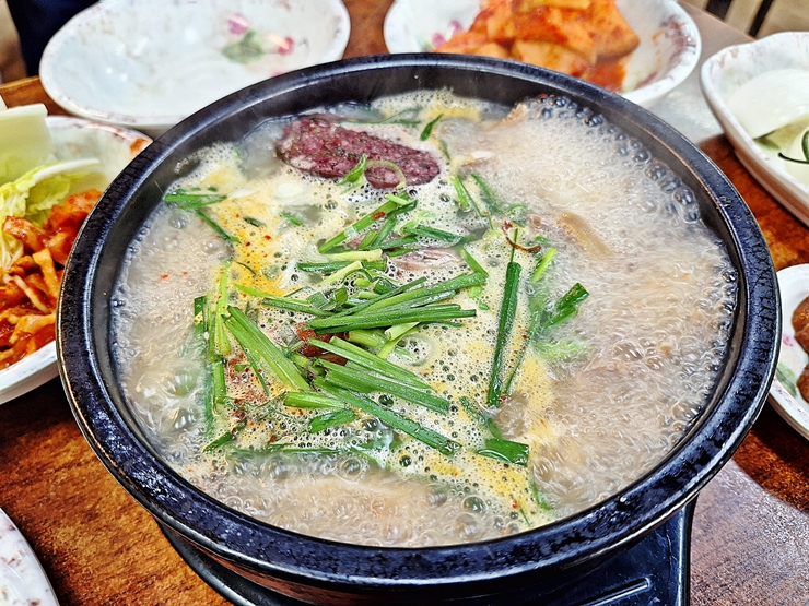 술국. 상당한 사이즈의 뚝배기가 나온다. 술국은 순댓국이 사이즈가 커지고 밥이 제공되지 않는다. 내가 좋아하는 부추가 많이 들어 있어서 만족스럽다. 추가로 부추를 요청할까 했지만 이 정도면 충분할 것 같아서 요청하지 않았다.