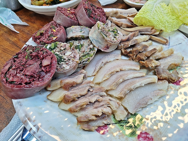 빠르게 나온 모둠 순대. 막창 순대, 백 막창 순대, 오소리 감투와 머릿고기가 나온다. 가격을 고려하면 상당한 양이다. 요새 서울에서 이런 수제 막창 순대를 보기 힘든데 척 봐도 훌륭한 퀄리티라는 것이 느껴졌다.