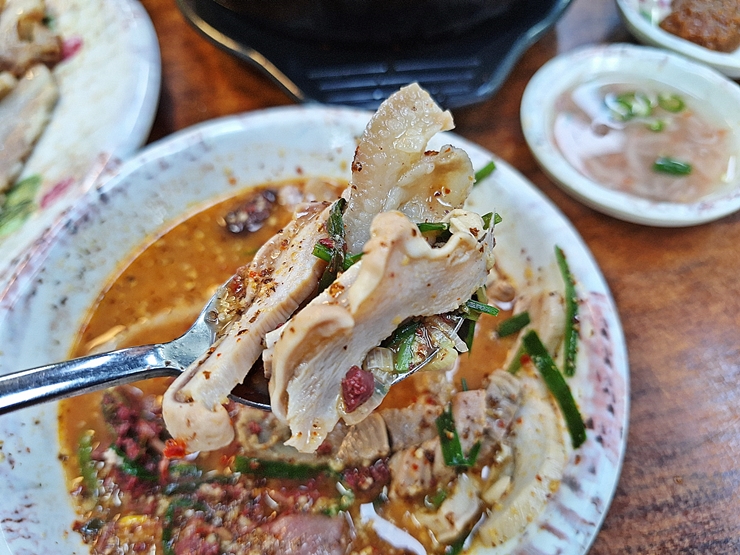 아름다운 모습의 막창 순대. 특이하게 순대 소로 버섯이 들어간다. 한 입에 먹기 무리일 정도로 사이즈가 크기 때문에 사진을 찍은 후 반으로 잘라 먹었다. 선지의 고소한 맛이 입 안을 가득 채우면서 버섯, 우거지의 맛도 잘 느껴진다. 부담스럽지 않은 묵직함이 참 마음에 들었다.