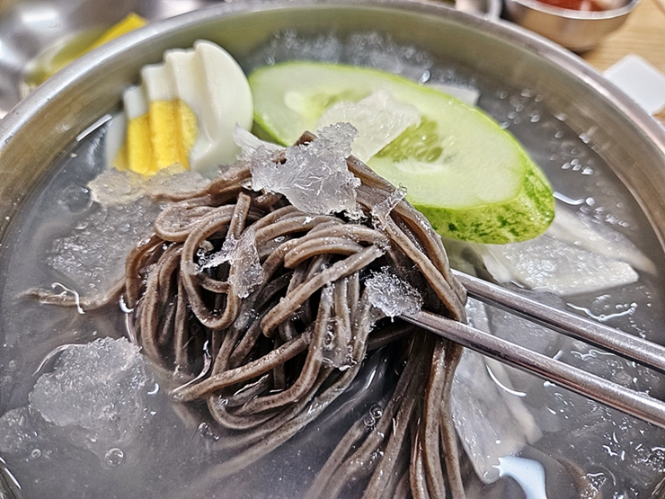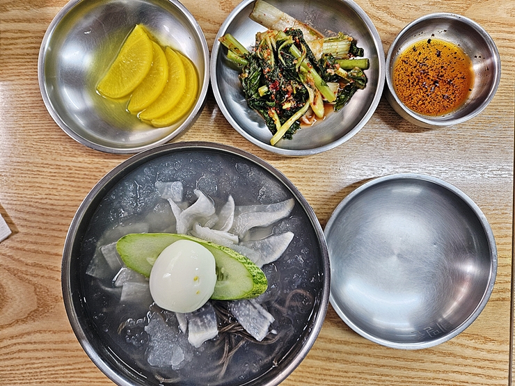 반찬과 함께 나온 동치미 막국수. 반찬은 단무지와 열무 김치가 나오고 전병을 주문해서 그런지 간장도 함께 나왔다. 동치미 막국수는 척 봐도 시원하게 생겼다. 이제 날이 많이 추워졌지만 더운 날에는 이렇게 시원한 요리를 먹는 것이 좋다.