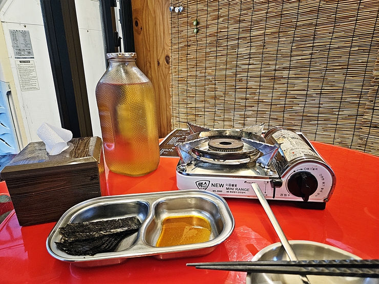 기본 반찬인 김과 참기름이 나오고 옛날 주스 병에 보리차가 나온다. 어릴 때는 저렇게 생긴 주스 병을 쉽게 볼 수 있었는데 이제는 굉장히 레트로한 감성 아이템이 되었다. 김이 눅눅하지 않아 좋았다.