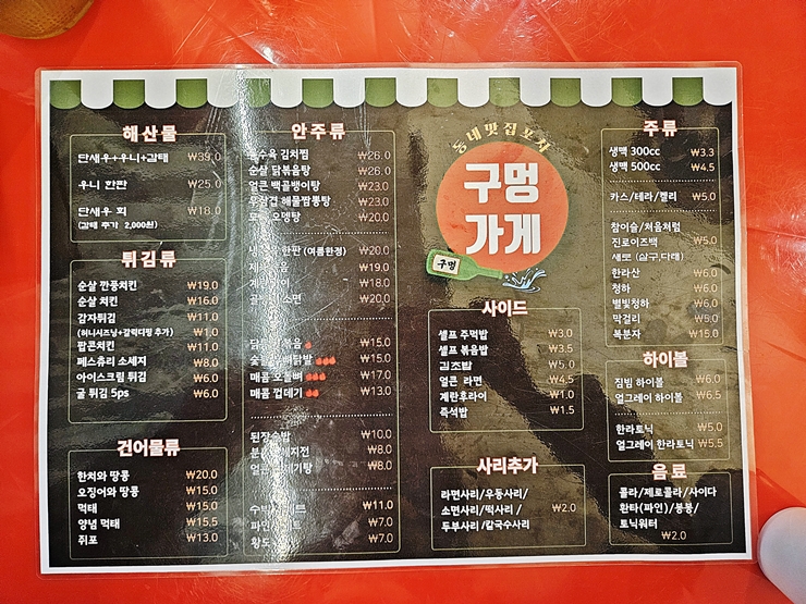 메뉴. 의외로 해산물도 판매를 하고 있고 그 밖에 치킨, 한치, 오징어, 김치찜, 닭도리탕, 껍데기와 골뱅이 탕도 판매하고 있다. 우리는 식사와 안주를 함께 해결하기 위해 이것저것을 주문해서 먹어보기로 했다.