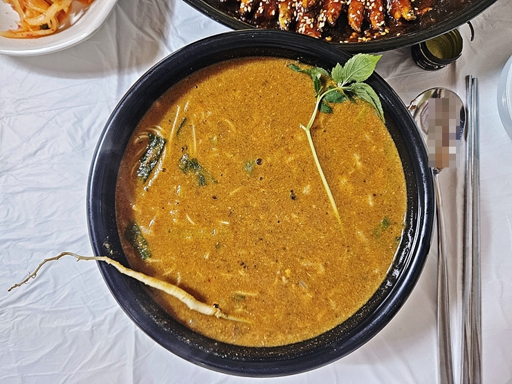 곱고 아름다운 어죽의 모습. 수삼이 하나 들어있는 것이 인상 깊다. 가격을 고려하면 들어가는 재료의 구성이 참 화려하다. 서울에서는 절대 이 가격에 이런 어죽을 먹을 수 없지.