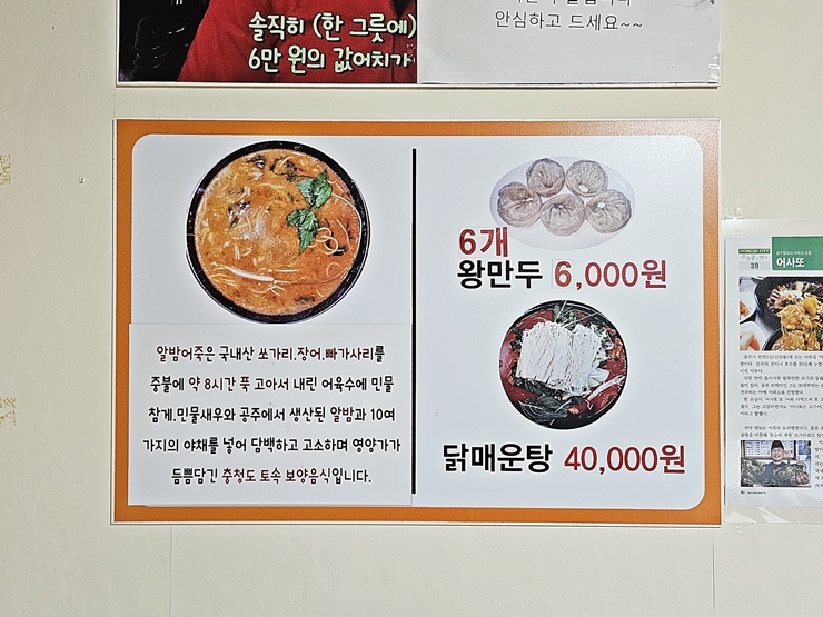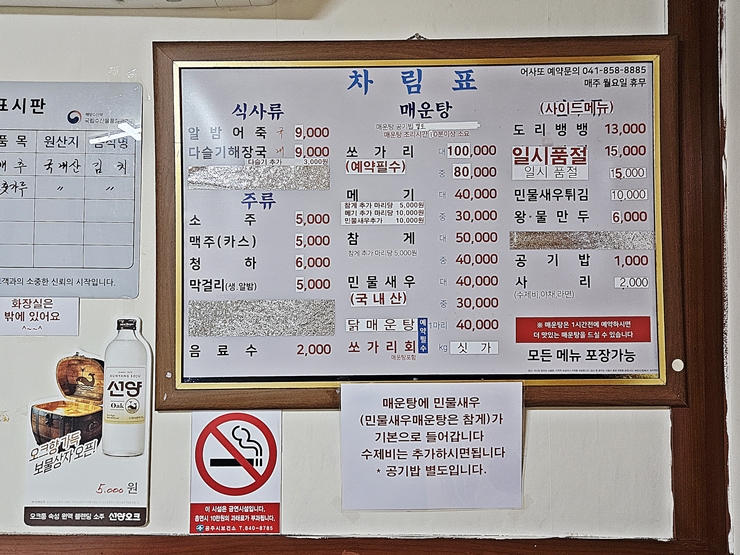 메뉴. 어죽, 다슬기 해장국, 쏘가리 매운탕, 메기 매운탕, 참게 매운탕, 민물 새우 매운탕, 닭 매운탕, 쏘가리 회, 도리뱅뱅이, 민물 새우 튀김과 만두를 판매하고 있다. 쏘가리 탕과 회의 경우 예약이 필수라고 한다. 쏘가리가 참 맛있긴 하지만 민물 생선이기 때문에 아직 회로는 먹어보지 않았다. 양식으로 나오는 민물 생선의 경우 회로 먹는 것도 괜찮다고 하지만, 아직 도전할 용기가 없다. 우리는 어죽과 도리뱅뱅이를 주문했다.