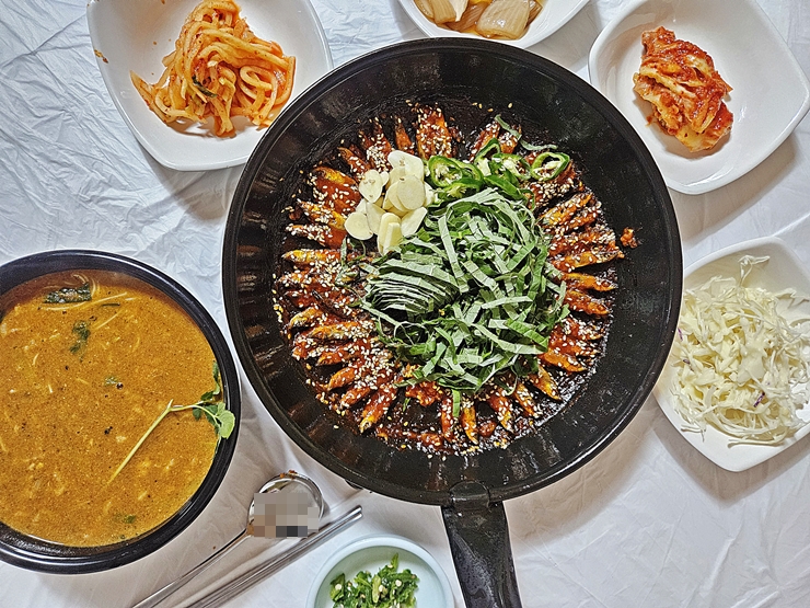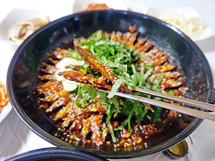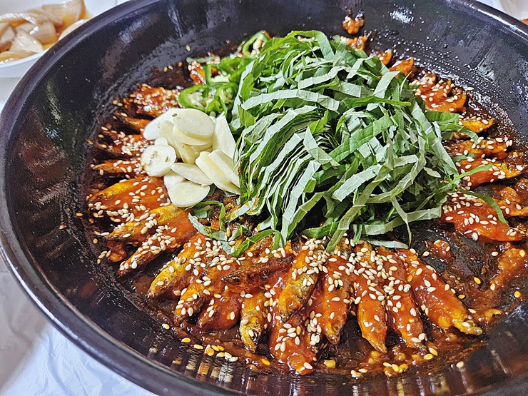 도리뱅뱅이도 빠르게 나왔다. 도리뱅뱅이는 충청도의 향토 음식이라 할 수 있는데 주로 피라미나 빙어 같은 작은 생선을 사용한다. 내장을 간단하게 제거한 후 기름에 튀기듯이 구운 후 매운 양념을 발라 나온다. 도리뱅뱅이 위에는 갯잎, 고추와 마늘이 수북하게 올라간다. 가게에 따라 깻잎이 아닌 부추가 들어가는 경우도 있다.
