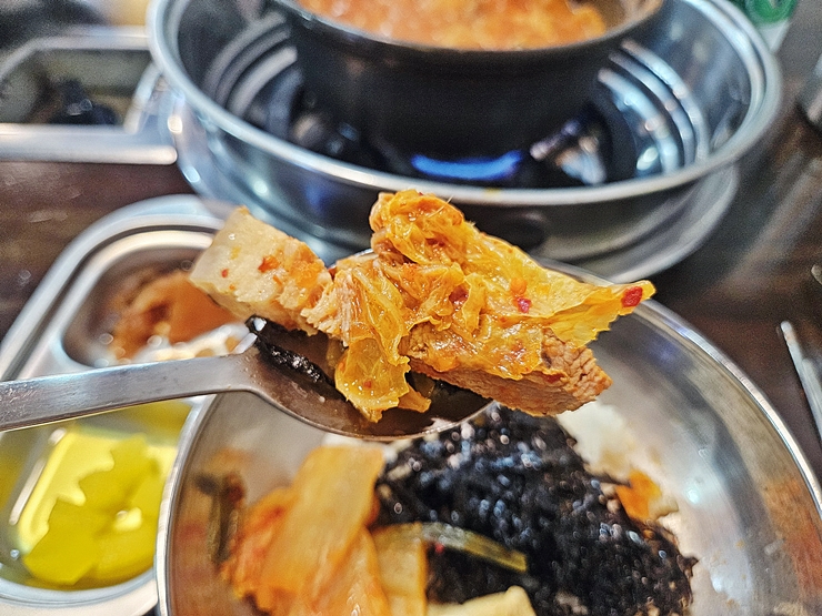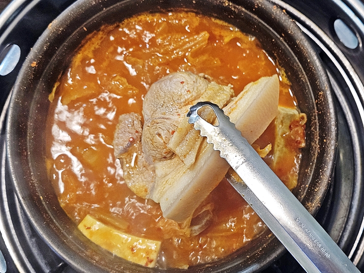 사진을 찍기 위해 예쁘게 담아봤다. 이렇게 담은 후 국물을 넣어 자작자작하게 먹었지. 고기는 껍데기 부분도 들어 있는데 껍데기에서 잡내가 전혀 나지 않아서 맛있게 먹었다. 같이 간 지인은 껍데기 구이는 먹어도 이렇게 삶은 껍데기는 싫어한다고 해서 먹지 않았다. 그래서 온전히 내가 다 먹었지. 김치찌개는 끓이면 끓일수록 맛있어진다.