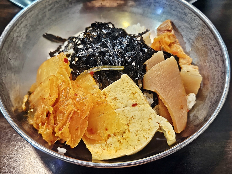 단무지와 짠지가 반찬으로 나오는 것이 인상 깊다. 처음 제공하는 양은 그리 많지 않은데 잔반을 줄이기 위한 조치인 것 같다. 한식당에서 김치가 안 나오는 것은 살짝 의외다. 김치찌개를 팔아서 그런가.