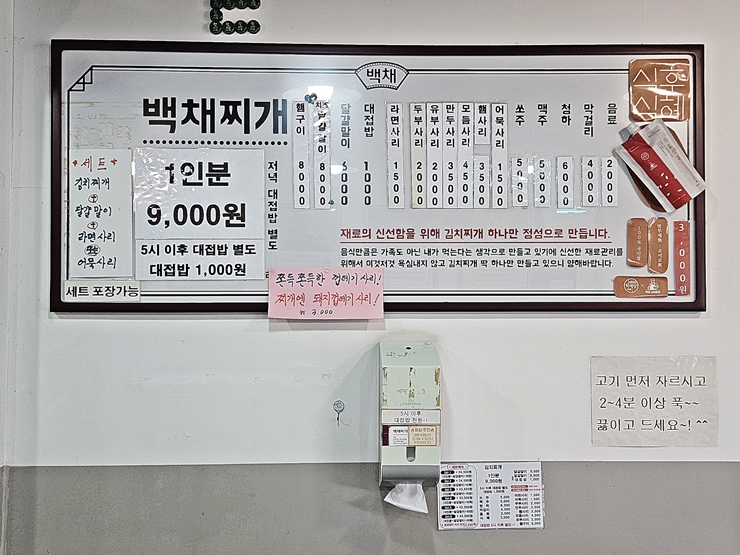 메뉴. 김치찌개, 햄 구이와 계란말이를 판ㄴ매하고 있고 그 밖에 각종 사리도 판매한다. 김치찌개 전문점이라 그런지 찌개는 김치찌개 하나 밖에 없다. 점심에 방문을 했기 때문에 우리는 김치찌개만 주문했다.