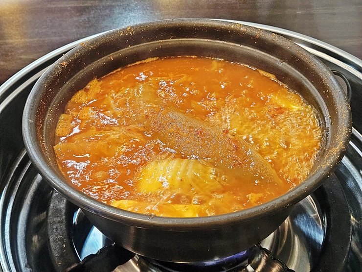 빠르게 나온 김치찌개. 한 번 팔팔 끓인 후 먹으면 된다고 해서 센 불로 끓였다. 끓고 있는 김치찌개에서 식욕을 돋우는 냄새가 강하게 난다. 역시 한국 사람은 김치를 먹어야지.