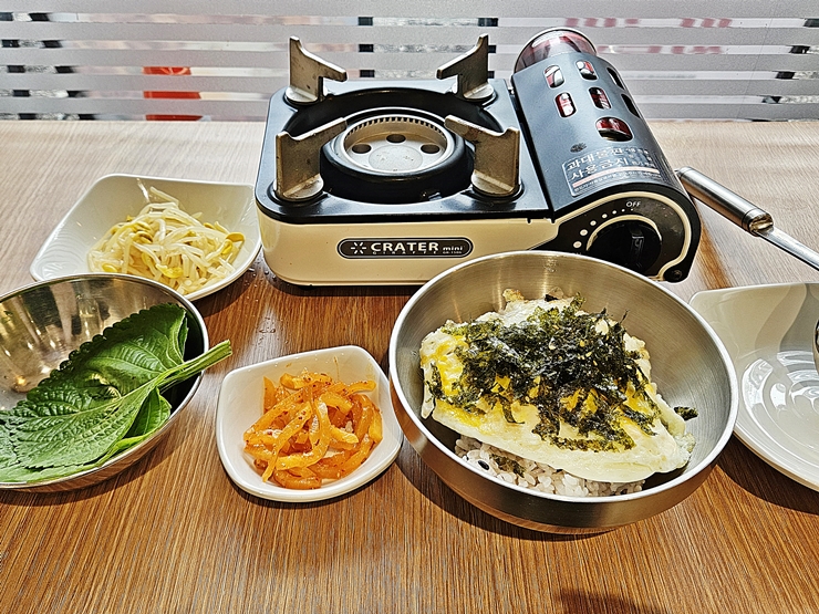 깻잎, 콩나물, 단무지 무침과 대접 밥이 나온다. 대접 밥에는 계란 후라이와 김가루가 올라간다. 참으로 아름다운 모습이 아닐 수 없다. 탄수화물을 조절하고 있기 때문에 밥은 다 먹지 않고 계란 후라이는 다 먹었지.