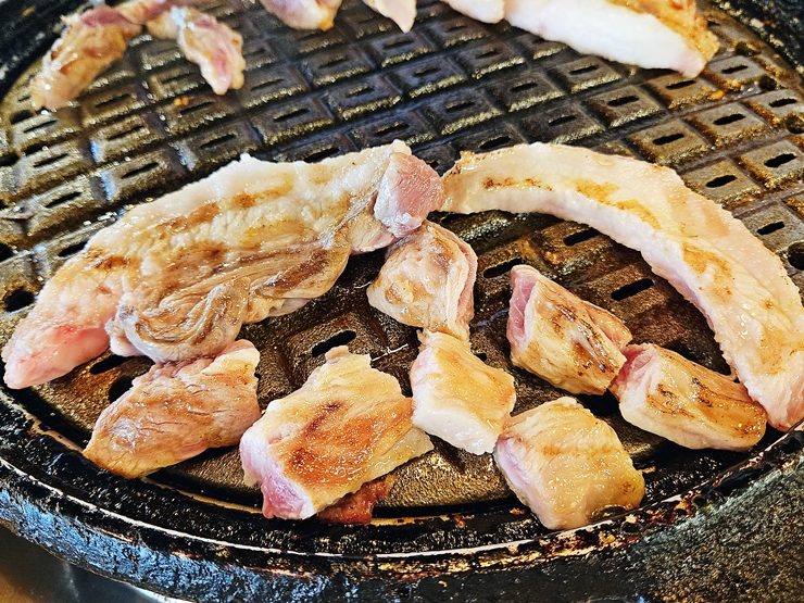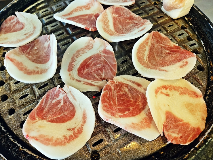 마치 냉삼이나 차돌박이 같은 모습을 보이는 돼지차돌. 그래서 돼지차돌이라는 이름을 붙인 것 같다. 이런 고기는 불판에 한가득 올린 후 굽는 것이 좋다. 괜히 감질나게 구우면 먹을 때 흐름이 끊기기 마련이고, 흐름이 끊기면 마음이 어두워지기 마련이다.