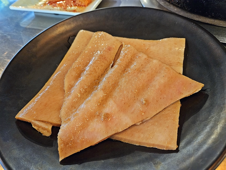 후식으로 주문한 돼지 껍데기. 주먹밥을 주문할까 잠시 고민을 했지만 과도한 탄수화물을 섭취하는 것은 지양하고 있기 때문에 콜라겐이 풍부하게 들어있는 껍데기를 주문했다. 껍데기는 요새 유행하는 스타일인 두꺼운 껍데기는 아니고 전통적인 껍데기의 모습이다. 내가 좋아하는 스타일이다.