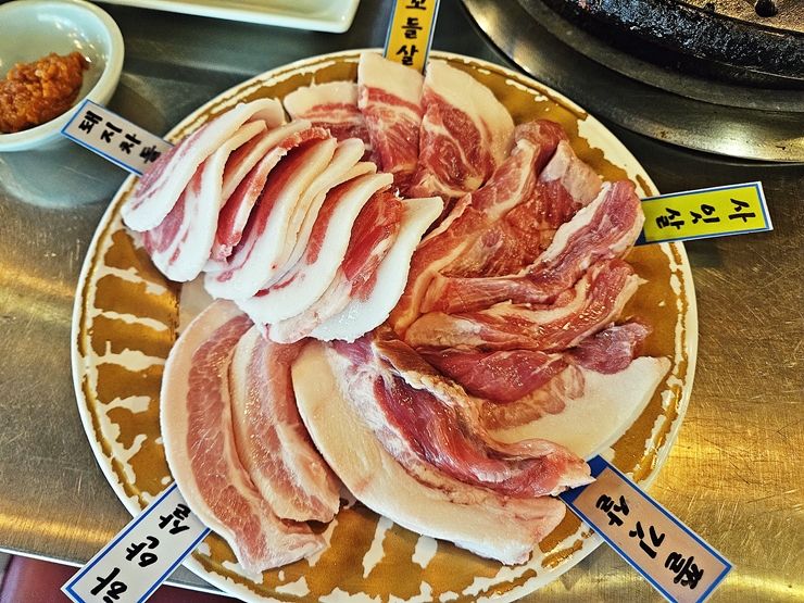 접시고기. 돼지차돌, 꼬들살, 사잇살, 쫄깃살과 하얀살의 구성이다. 고기에 대한 자세한 설명은 앞에서 했기 때문에 생략하기로 한다. 무슨 부위를 먼저 구워 먹으면 좋은지 물으니 돼지차돌을 먼저 먹고 나머지는 취향에 따라 먹으면 된다고 한다. 그렇다면 어디 한 번 돼지차돌을 맛있게 구워봐야지.