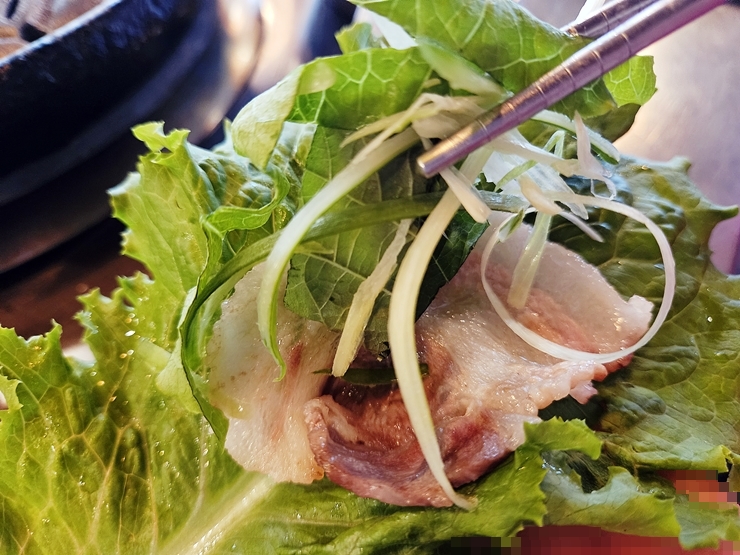 돼지차돌이 구워지는 모습을 올리는 것은 귀찮으니 생략하기로 한다. 돼지차돌이 맛있게 잘 익었으니 맛있게 한 번 먹어야지. 상추에 돼지차돌을 올린 후 내가 좋아하는 파채로 마무리해서 함께 먹었다. 돼지차돌은 쫄깃함과 부드러운 식감을 함께 가지고 있다. 지방이 많아서 눅진한 맛이 나는 것 역시 특징이다. 담백한 맛을 좋아하는 사람이라면 조금은 불호에 가깝겠지만 나에게는 극호로 다가왔다.