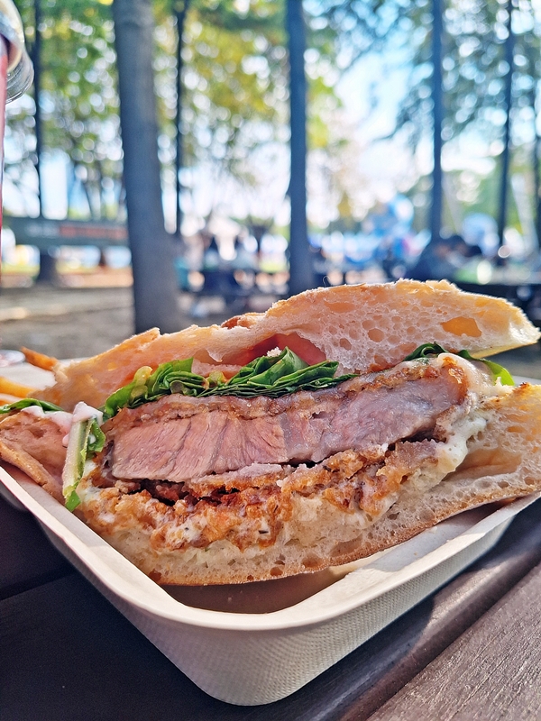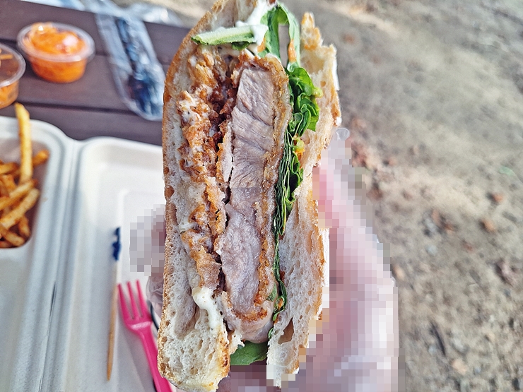 두툼한 목살 카츠가 인상적이다. 목살 카츠와 더불어 루꼴라와 크림 치즈 등이 들어 있어서 상당히 헤비한 느낌이 든다. 하나만 먹어도 충분히 배가 부를 것이라는 말이 거짓이 아니었다. 탄수화물을 줄이고 있기 때문에 빵을 좀 덜어내고 먹을까 잠시 고민했지만, 그러면 제 맛을 느끼지 못할 것 같아서 그냥 다 먹기로 했다.