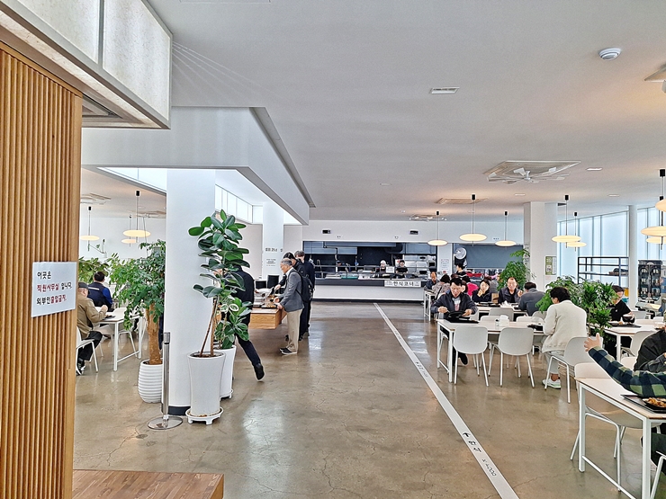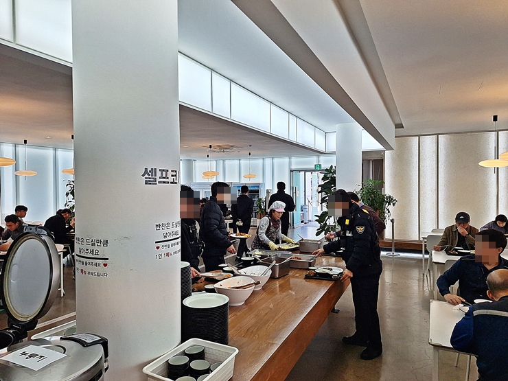 반찬을 받으려고 셀프 코너에 가니 많은 수의 경찰들이 반찬을 담고 있었다. 지역이 지역이어서 그런지 많은 경찰들이 상주하는 것 같다. 그 밖에 전쟁기념관을 방문한 관람객과 직원들로 보이는 사람들이 식사를 하고 있다.