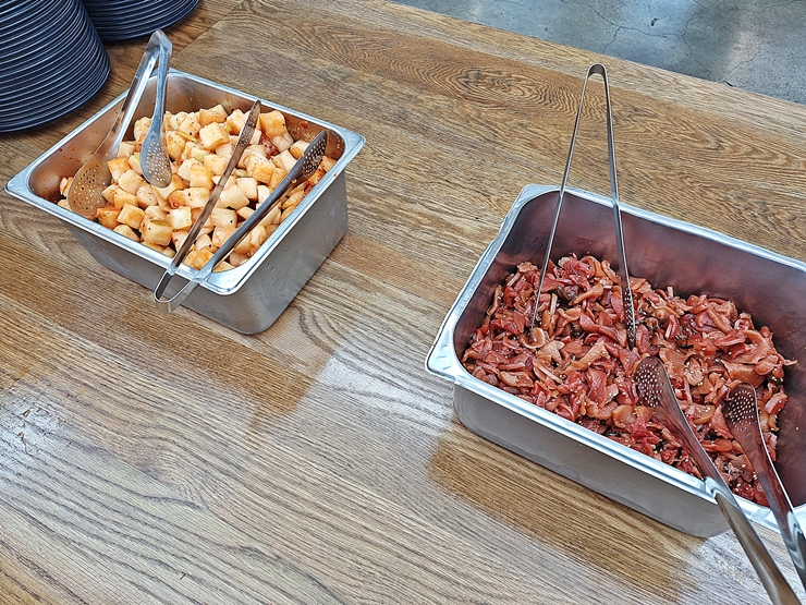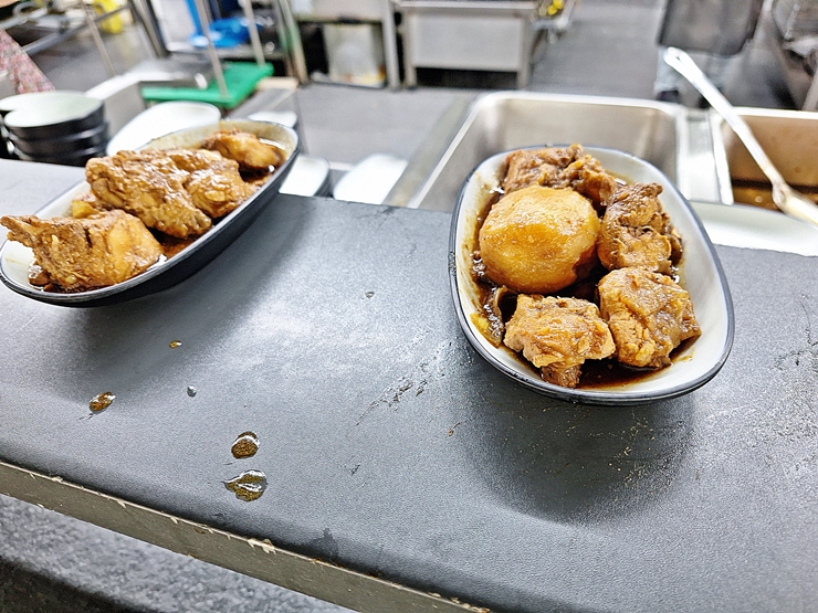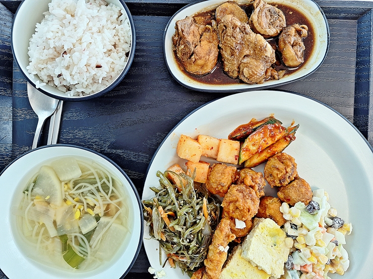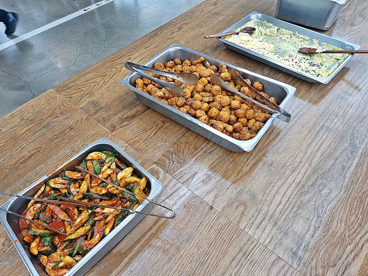 밥, 국과 메인 반찬은 받아가면 되고 다른 반찬은 알아서 떠서 먹는 구조다. 우리가 방문했을 때는 메인 메뉴로 찜닭이 나왔고, 국으로는 북엇국이 나왔다. 전 날 술을 마시지 않았지만 북엇국은 몸에 좋으니 기분이 좋았다.