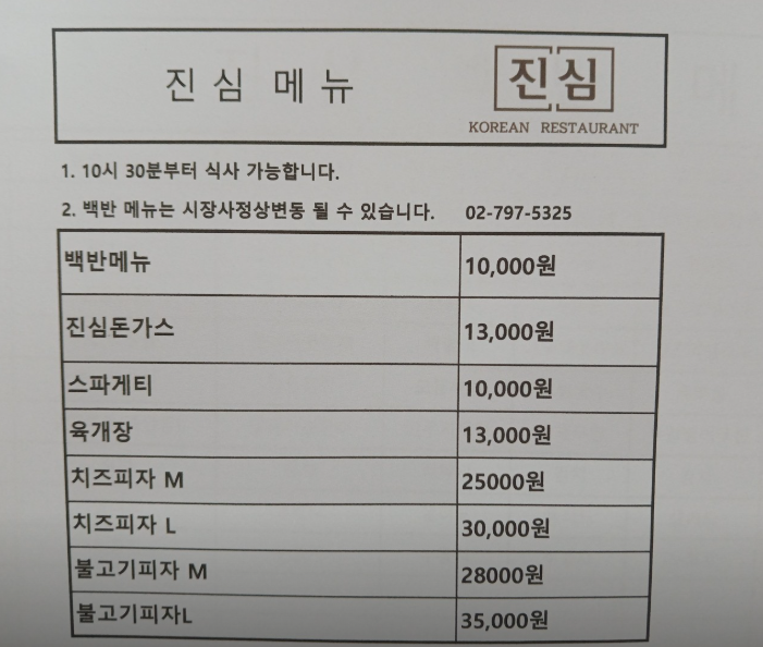 진심에서는 백반, 돈가스, 스파게티, 육개장과 피자를 판매하고 있다. 여기까지 와서 돈가스 같은 음식을 먹는 것은 옳지 않으니 백반을 주문했다. 주문은 키오스크로 하면 되고 음식을 받을 때 영수증을 제출하면 된다. 백반 메뉴는 매일 바뀌기 때문에 내가 방문했을 때 메뉴와 지금의 메뉴는 다소 다를 수 있다.