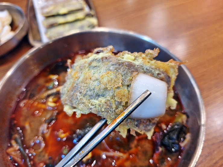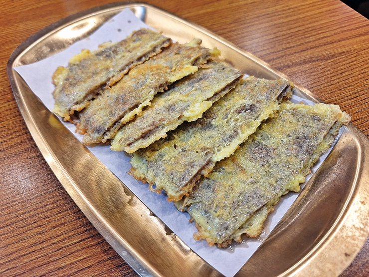 먼저 육전의 맛을 보기로 했다. 육전에 양파 장아찌를 올려 먹었다. 육전은 완자와 다르게 바로 부쳐서 제공하는데 그래서 그런지 따뜻하고 소고기의 풍미가 잘 느껴졌다. 육전은 어떻게 만들어도 맛없게 만들기가 어렵다. 육전을 먹으니 저절로 소주 한 잔이 생각났지만 저녁에 술 약속이 있어서 꾹 참았다.