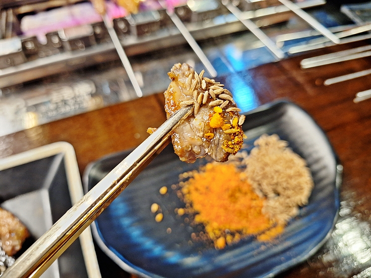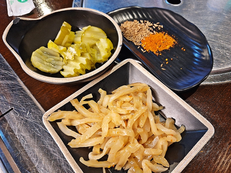 양꼬치에 소스와 쯔란을 찍어 맛있게 냠냠. 양고기 특유의 지방 맛이 강하게 느껴짐과 동시에 고소함이 입 안을 가득 채운다. 이 맛에 양꼬치를 먹는 거지. 이런 양꼬치 한 점에 소주 한 잔 마시면 천국을 느낄 수 있다.