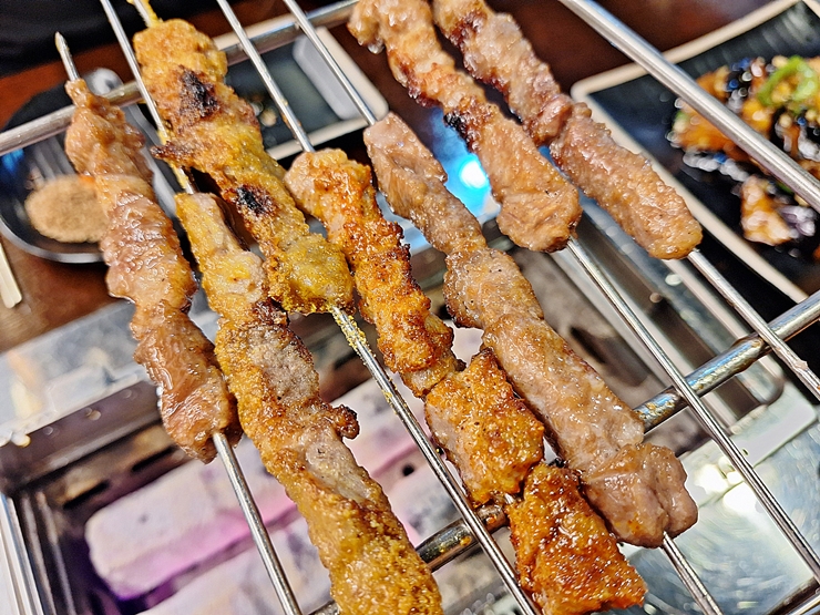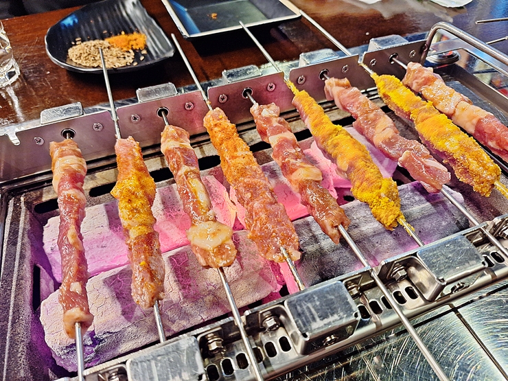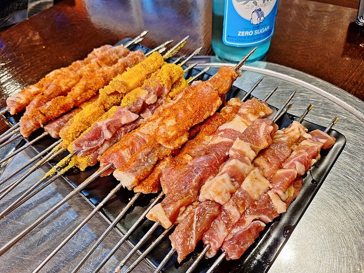 빠르게 나온 모둠 양꼬치. 모둠 양꼬치는 일반, 카레맛, 매운맛과 달달한 맛이 나온다. 총 20개가 나오는데 각각 5개가 나와 밸런스를 잘 맞춘다. 고기가 나왔으니 이제 맛있게 구워봐야지.