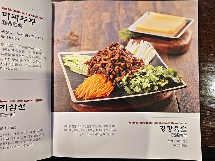 메뉴. 양꼬치를 비롯해서 마파두부, 지삼선, 경장육술, 꿔바로우, 라조기, 라즈지와 향라 오징어 등 다양한 중국 요리를 판매하고 있다. 요리 수준이 상당히 높아서 어중이 떠중이 중국집보다 훨씬 높은 퀄리티를 보인다. 우리는 다양한 맛의 양꼬치와 요리를 즐기기 위해 모둠 양꼬치, 지삼선과 라즈지를 주문했다.