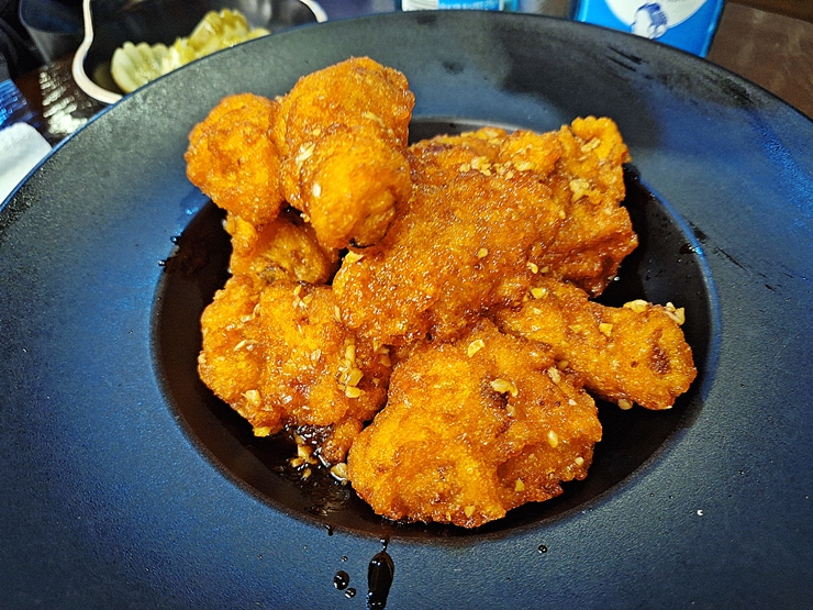 라즈지. 중국 본토에서 먹는 라즈지와는 살짝 다른 맛이 나는데, 우리나라 사람 입맛에 맞게 바꾼 것 같다. 바삭하게 튀긴 닭에 매운 소스를 가미했다. 소스 색이 많이 붉지 않지만 매운 맛은 상당했다. 매운 것을 잘 먹지 못하는 나에게는 좀 힘들었다. 같이 간 일행들은 맛있다며 잘 먹었지.