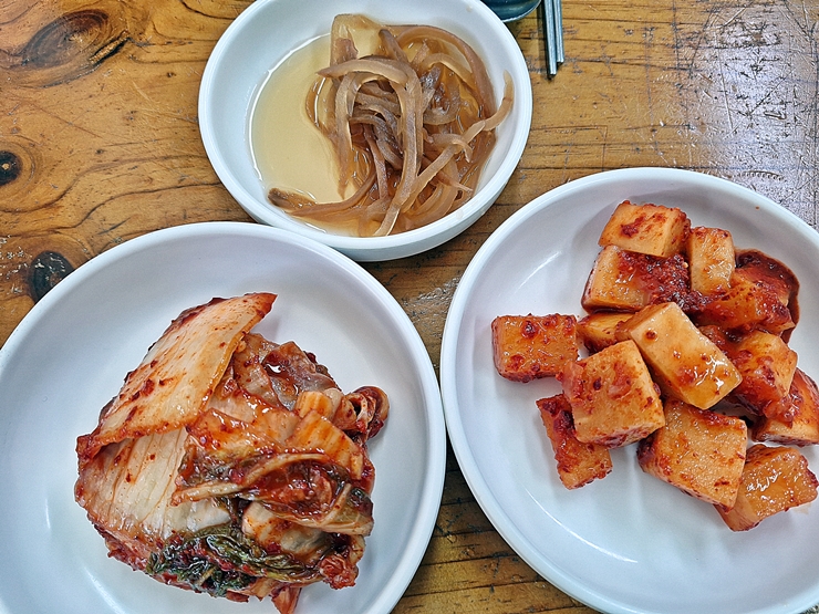 반찬. 무 장아찌, 김치와 깍두기가 나온다. 무 장아찌는 내 입에 너무 짰고 김치는 시원한 맛이 좋았다. 깍두기는 상대적으로 평범했다. 그래서 김치만 많이 먹었지.