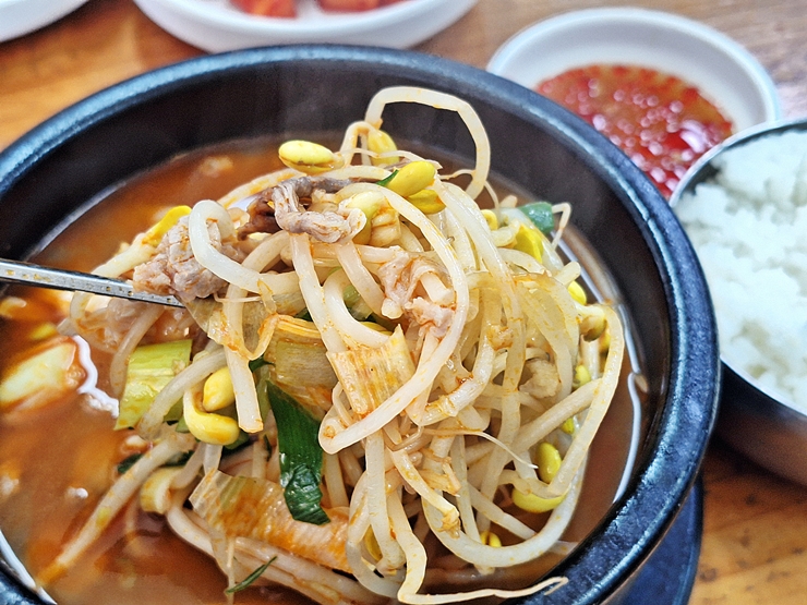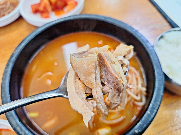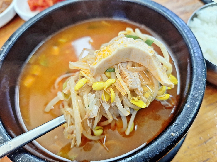 내장탕 안에는 콩나물, 파와 여러 종류의 내장이 굉장히 푸짐하게 들어있다. 12,000원이라는 가격이 아깝지 않은 금액이다. 국물에서는 소 내장의 향이 깊게 나는데, 한 입 마셔보니 누린내는 전혀 느껴지지 않고 기분 좋은 묵직함만 느껴진다.