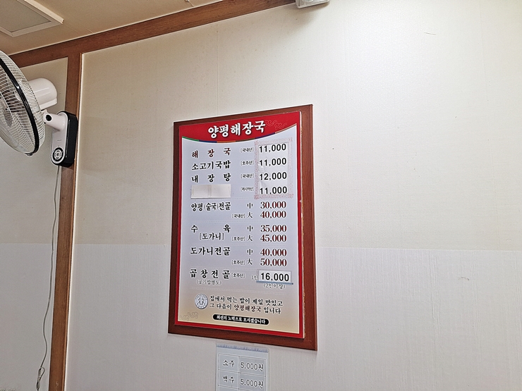 메뉴. 해장국, 소고기 국밥, 내장탕, 술국, 소육, 도가니 전골과 곱창 전골을 판매하고 있다. 그냥 해장국은 선지가 들어간 해장국이라고 한다. 우리는 내장탕을 주문했다. 주변을 둘러보니 다들 반주 한 잔을 하고 있길래 소주가 생각났지만 오후 일정도 있고 해서 술은 주문하지 않았다. 역시 절제력이 몹시 뛰어난 멋진 나.