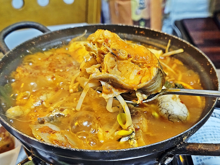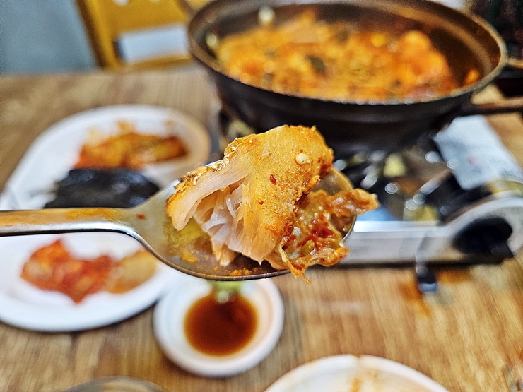 큼직한 사이즈의 동태 조각. 역시 내 예상과 다르지 않게 냉동을 사용한다. 그래도 이 정도 가격에 이 정도 구성이면 충분히 값어치를 한다. 오래된 냉동 동태를 쓸 경우 자칫하면 쿰쿰한 냄새가 나기 마련인데 그런 기분 나쁜 냄새는 나지 않았다.