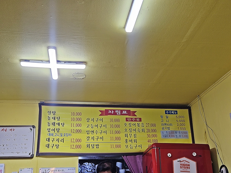 메뉴. 탕으로는 동태탕과 대구탕을 판매하고 있고 구이로는 삼치, 고등어, 임연수와 갈치가 있다. 그 밖에 오징어 볶음, 오징어 숙회 등도 있다. 가격을 고려하면 당연히 생물은 무리고, 냉동을 사용할 것 같다. 우리는 동태탕과 소주를 주문했다. 동태탕을 먹으면 술이 깨는 효과가 있지.